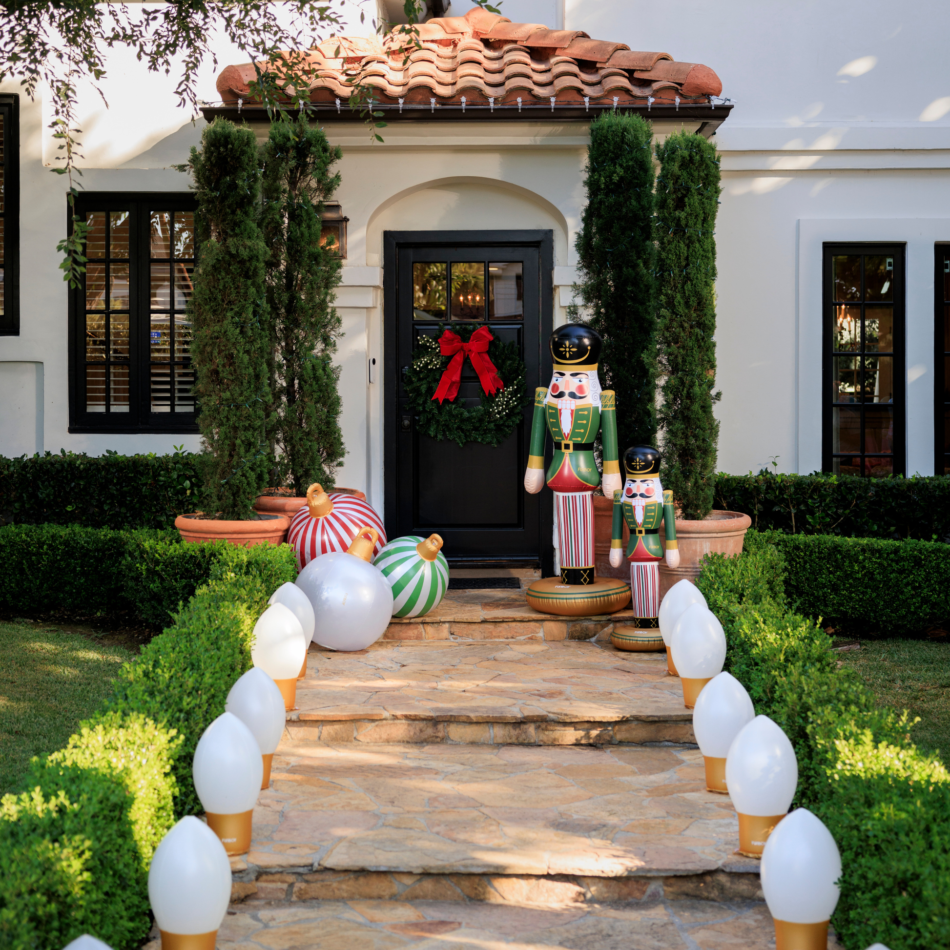 Deck your halls with FUNBOY's 17" inflatable light-up Christmas Bulb Two Pack to create your holiday scene indoors or out. Weatherproof design with weighted, flat base that stands upright or can be hung with integrated hang rings and included string. Integrated LEDs shine in 9+ colors with multiple modes (batteries included). Remote control and timer allow easy use. Deflates for compact storage. Includes pump and batteries.