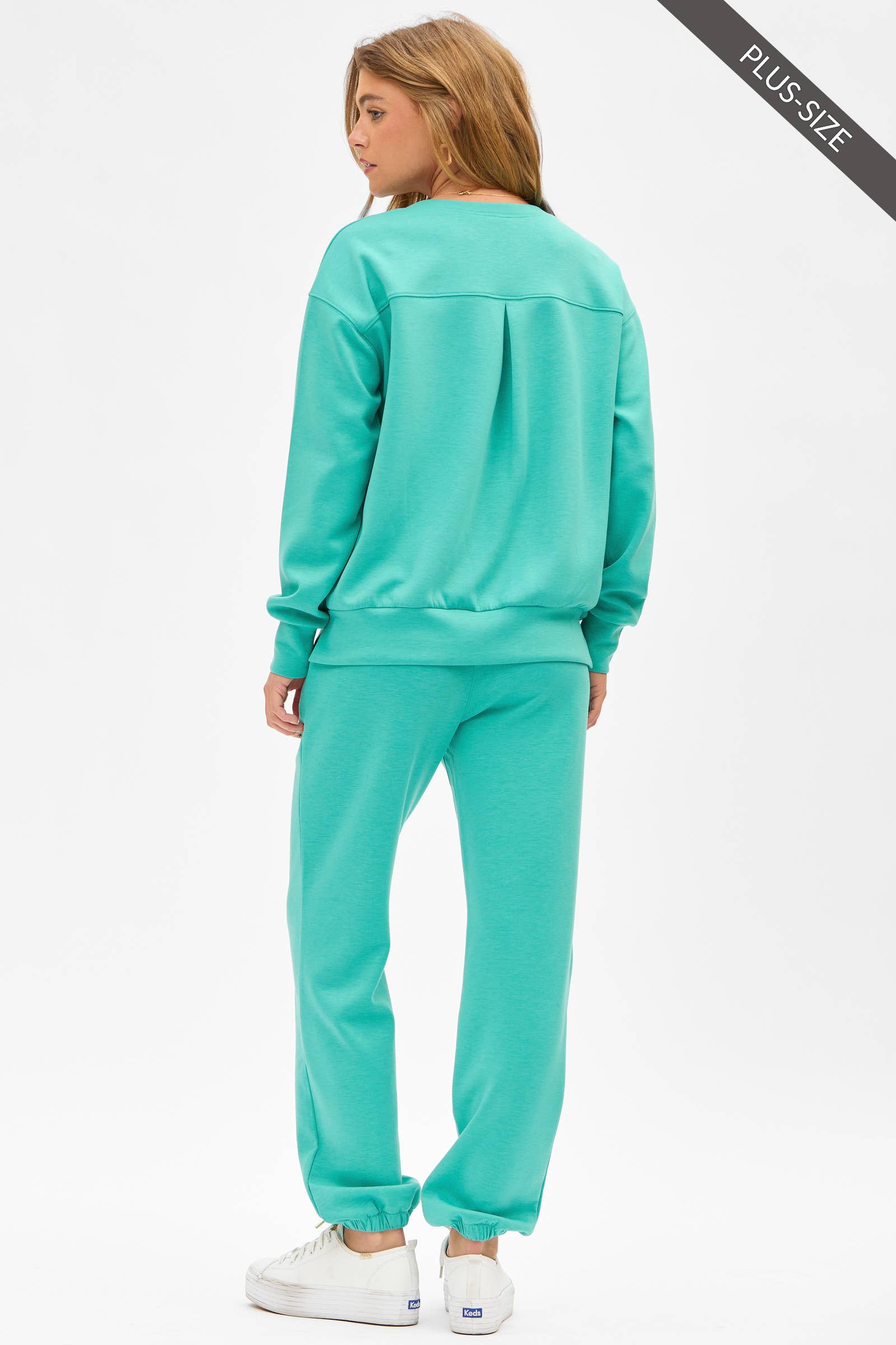 Meet your new favorite not-so-basic set from our Travel Collection! This chic pullover and matching jogger pants combo is designed for effortless style and all-day comfort. The pullover features a classic round neckline, banded sleeves and hem, elevated with a stunning pleated back detail and subtle X-stitching on the front. The jogger pants are complete with an elastic waistband and drawstring for an easy, flattering fit. Wrinkle-free and travel-ready, this set is perfect for a polished airport look or packing for your next getaway. Just throw it on and step out in style—no fuss, no wrinkles, just easy! • Inseam: 28' 5/8" • Model is 5’8” and wearing size Small
